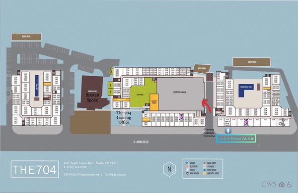 If you are heading South bound on S. Lamar Blvd., the 704 complex will be located on your left hand side. You will pass Broken Spoke and on the next traffic light you will take a left hand turn into the 704 parking garage. When exiting the parking garage Lash & Brow Austin will be the second suite located on the left hand side.